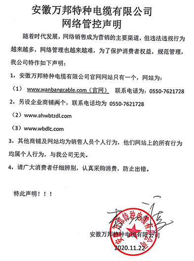 鄭重聲明:安徽萬邦特種電纜有限公司官方網站為:www_wanbangcable_com.458854549.com,除此之外無任何子網站或合作網站,其余均為假冒偽劣。電話:0550-7621728 13485756353 地 址:安徽省天長市滁州高新技術產業開發區經四路29號